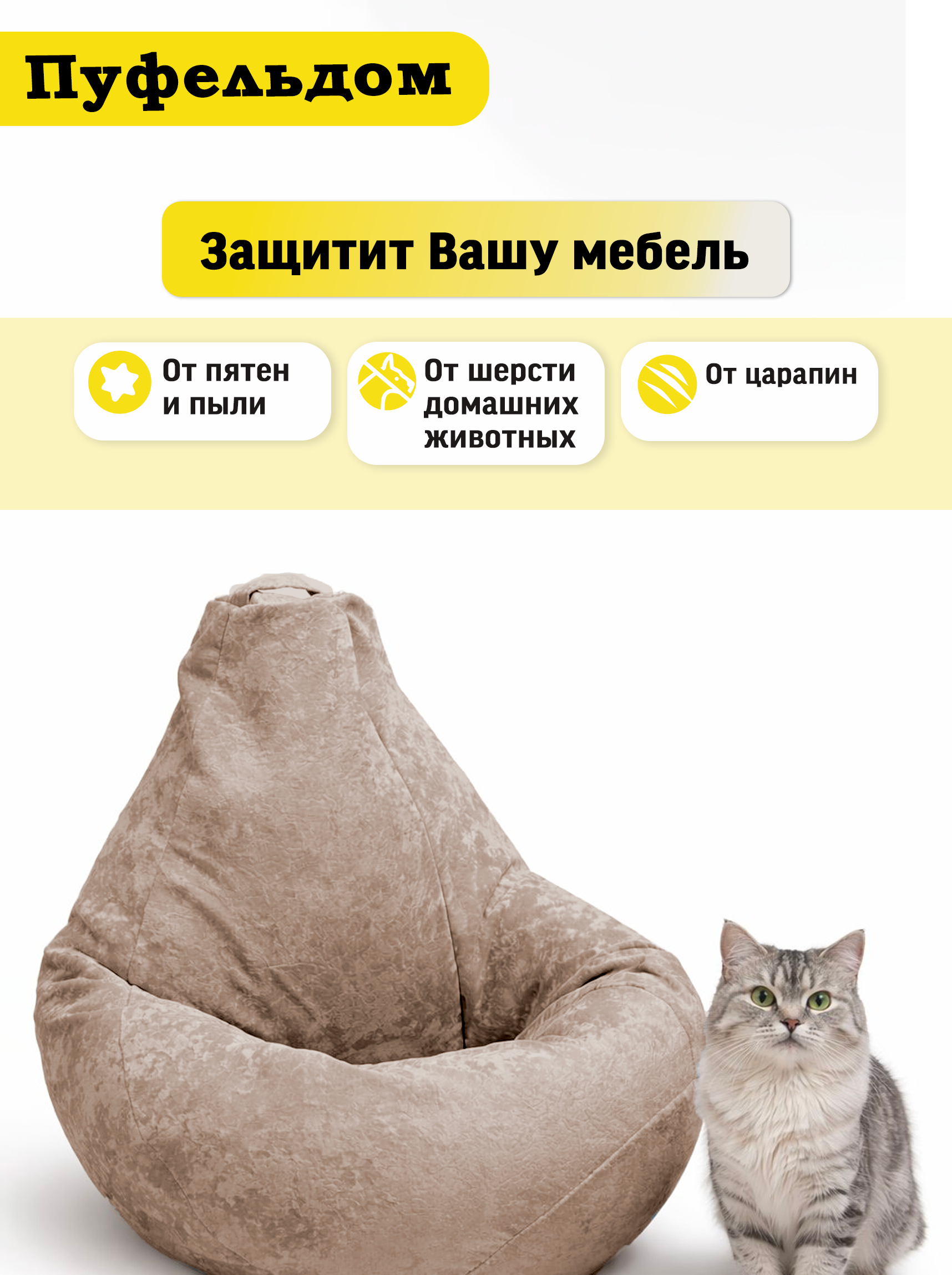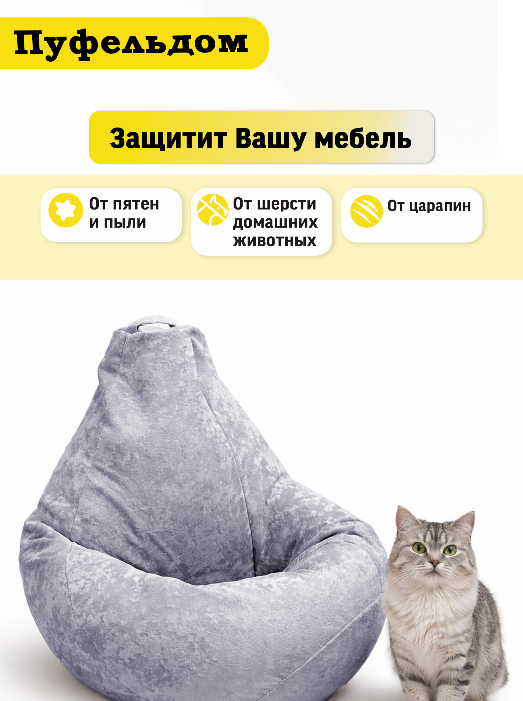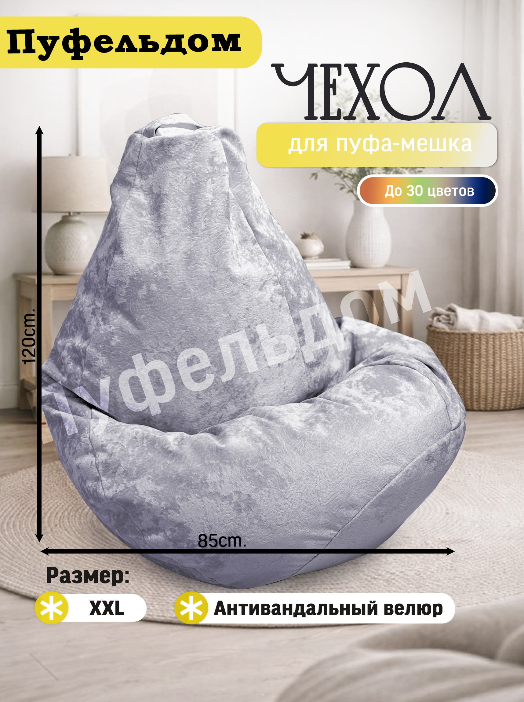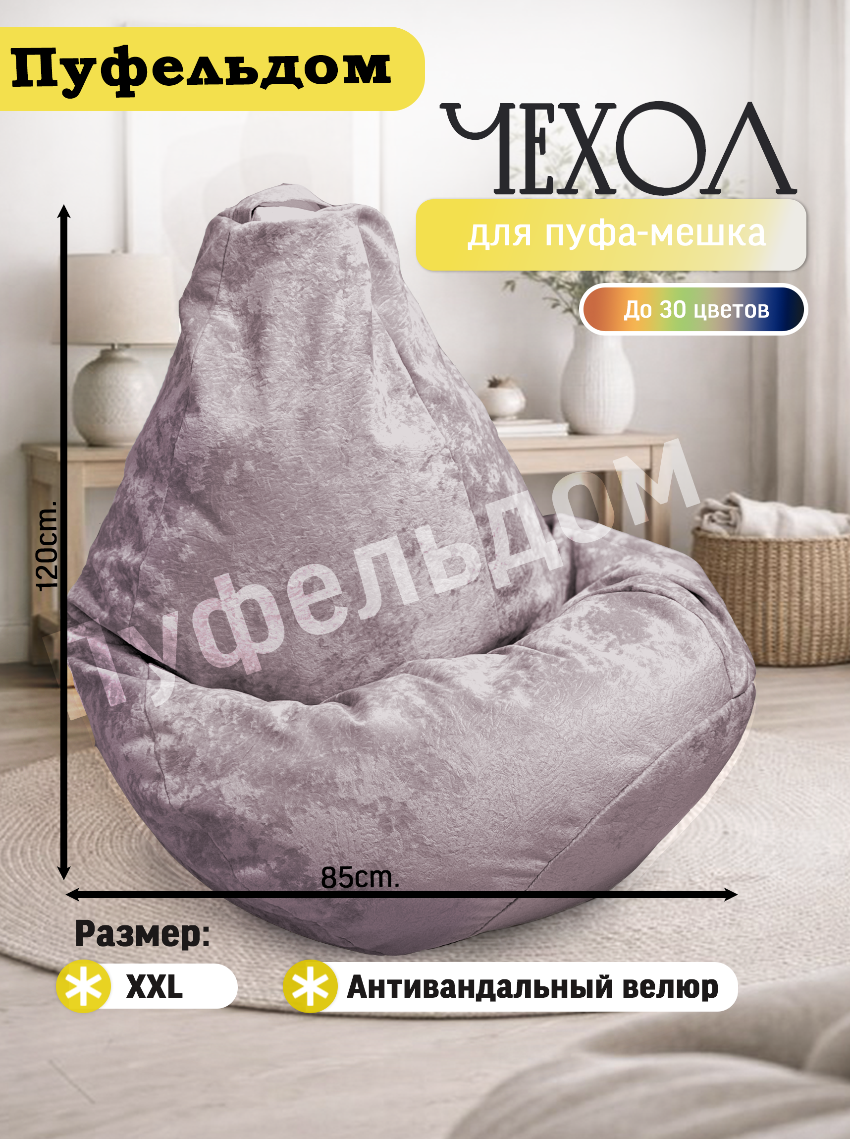 Чехол на кресло мешок изготовлен из мебельного велюра высокой плотности. Чехол для кресла мешка приятен на ощупь, легко стирается, противостоит когтям домашних животных! Изделие имеет ручку для переноса кресла. Детали чехла на кресло-мешок имеют усиленные швы. Размерный ряд верхнего чехла для кресламешка: XL - для кресла-мешка размером 110х70 см XXL - для кресла-мешка размером 120х85 см ХХXL - для кресла-мешка размером 130х100 см ХХXL - для кресла-мешка размером 140х120 см Реальный оттенок может отличаться от фото из-за особенностей настроек Вашего экрана.