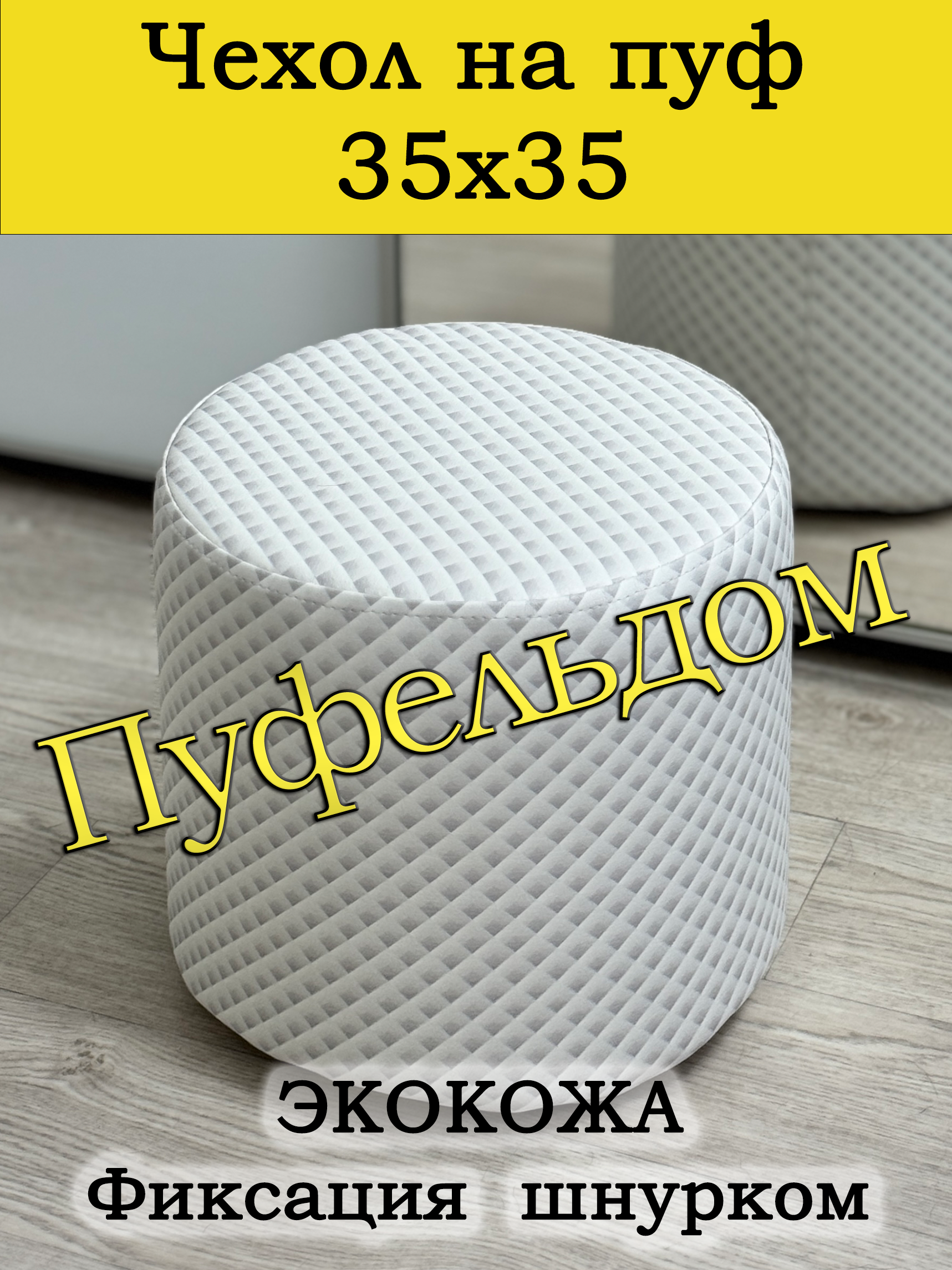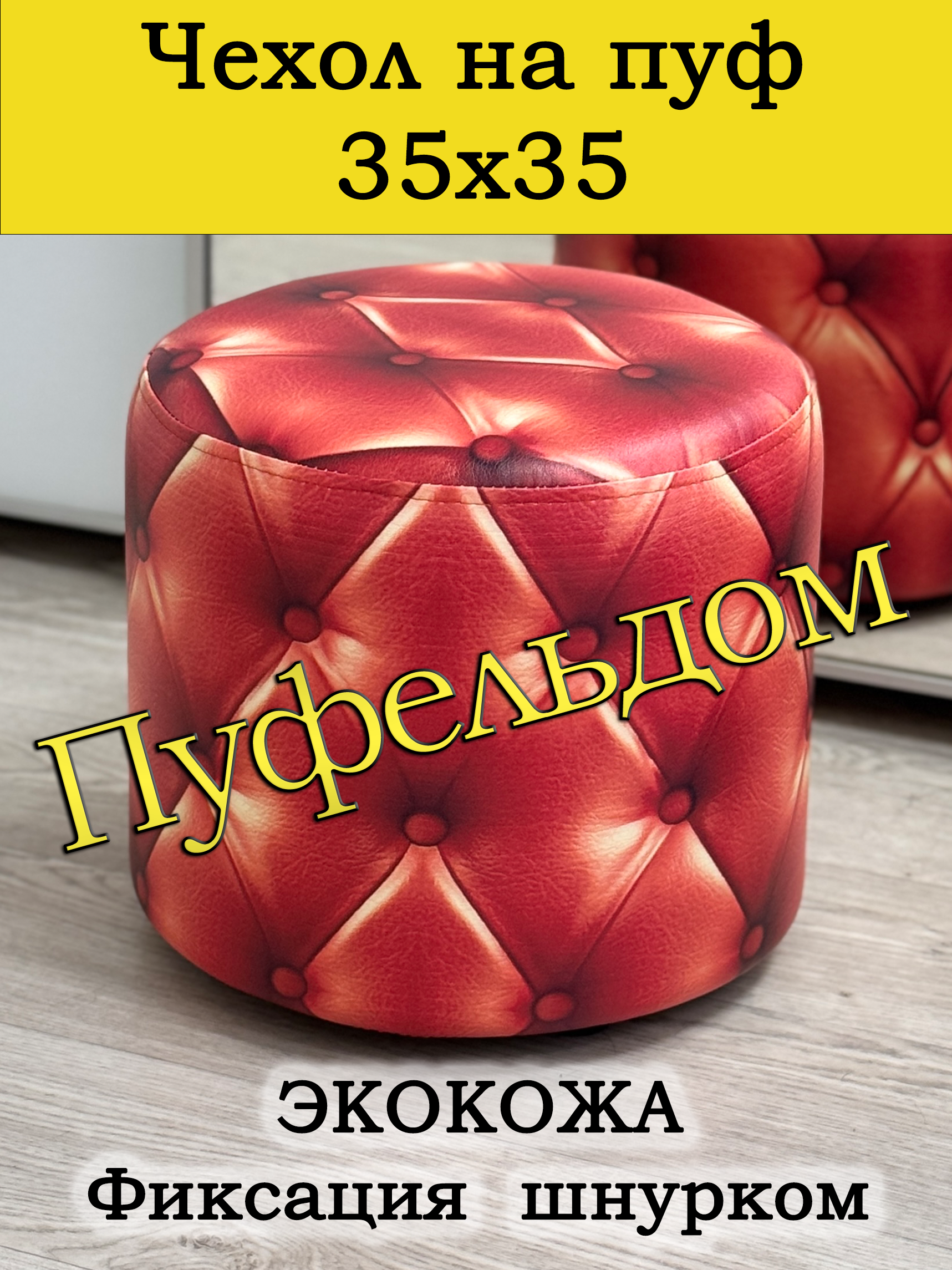 Чехол на круглый пуф 35 см в диаметре и высотой 35 см. Чехол на пуфик изготовлен из экокожи. Чехол может подойти на пуф круглый диаметром 34 и 36 см, при этом высота его изменится соответственно. Снизу фиксируется крепким шнурком - более надёжным аналогом резинки. Эта накидка на пуф защитит Ваш пуфик от загрязнений, царапин, когтей домашних животных и потёртостей. Чехол на пуфик вернёт жизнь Вашему старому пуфу, добавит изюминку интерьеру и поднимет Вам настроение. Чехол легко очищается от шерсти домашних животных, пыли, грязи и пятен. Наши чехлы на пуфы будут служить Вам долгие годы! Чтобы правильно подобрать размер чехла переверните свой пуфик вниз сиденьем, измерьте его высоту от пола до дна, измерьте расстояние от края до ножек на подгиб. Для измерения длины и ширины положите пуф на бок и измерьте расстояние от пола до верхней точки.