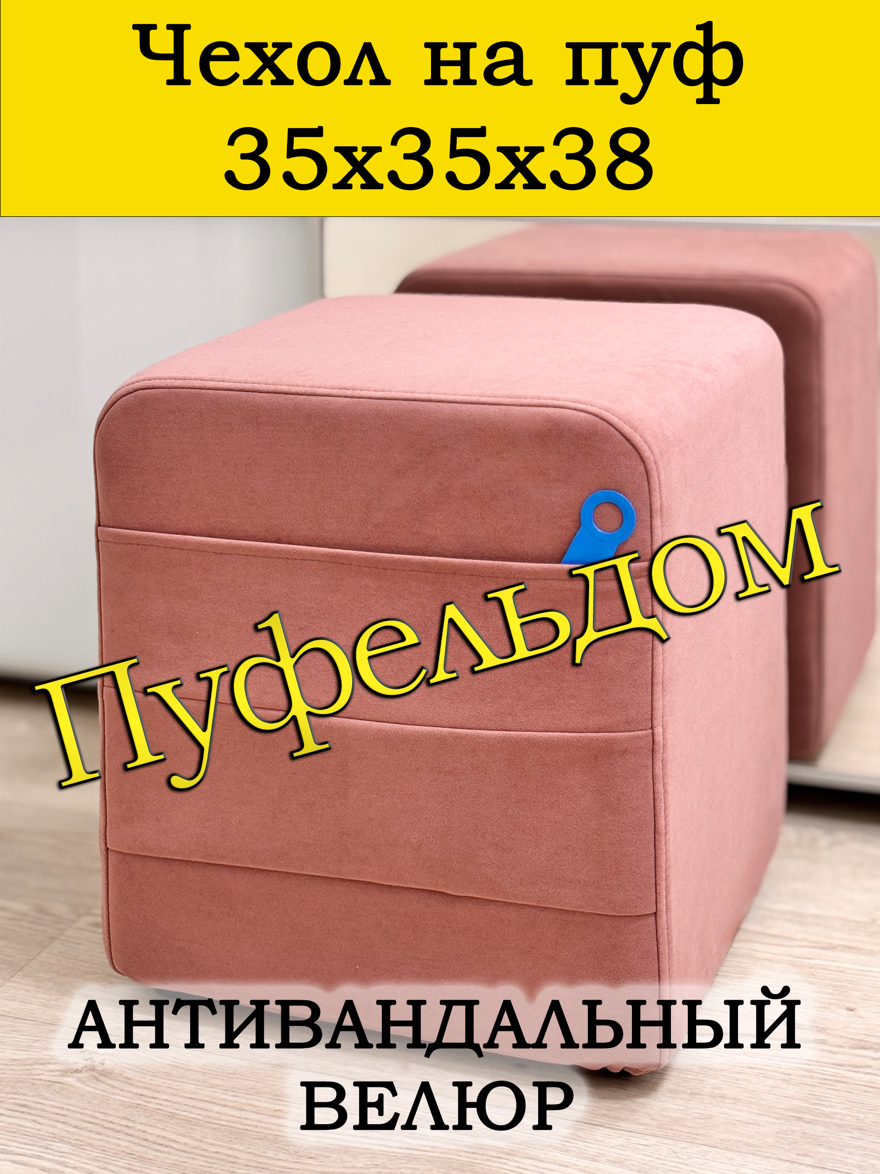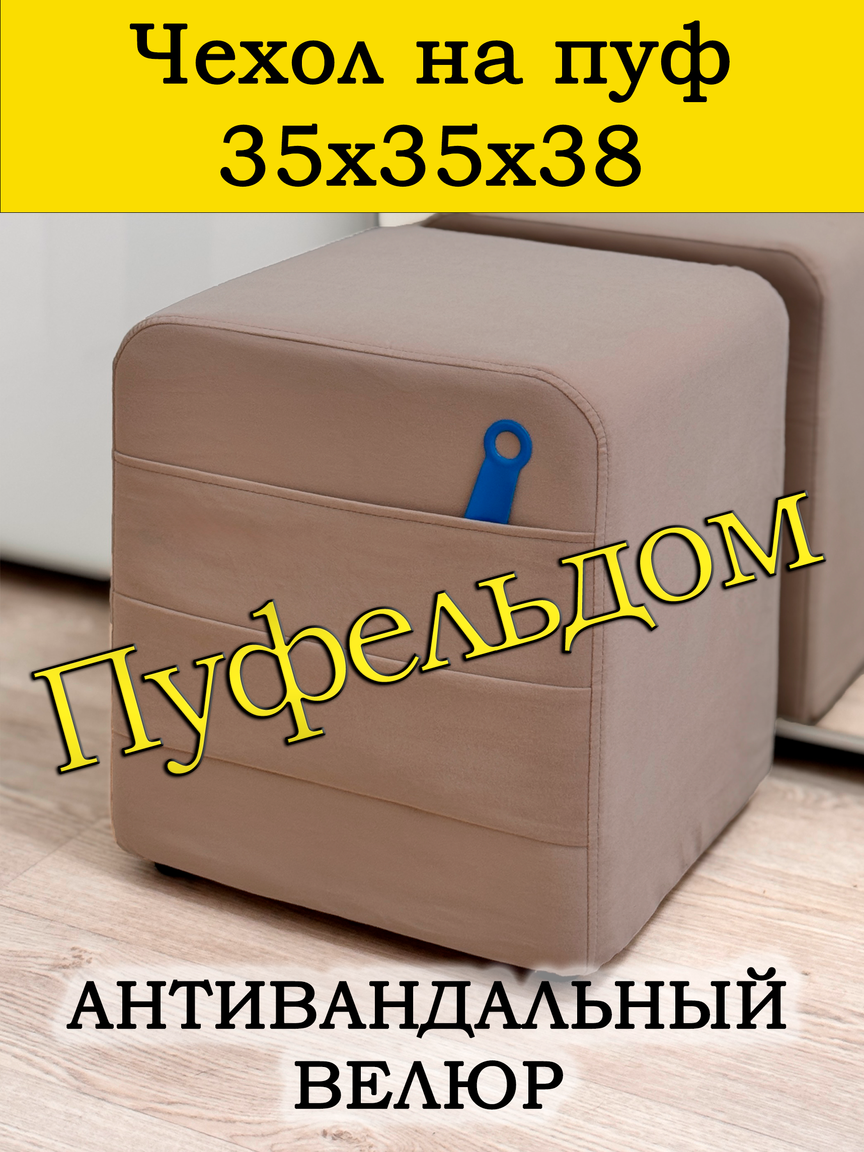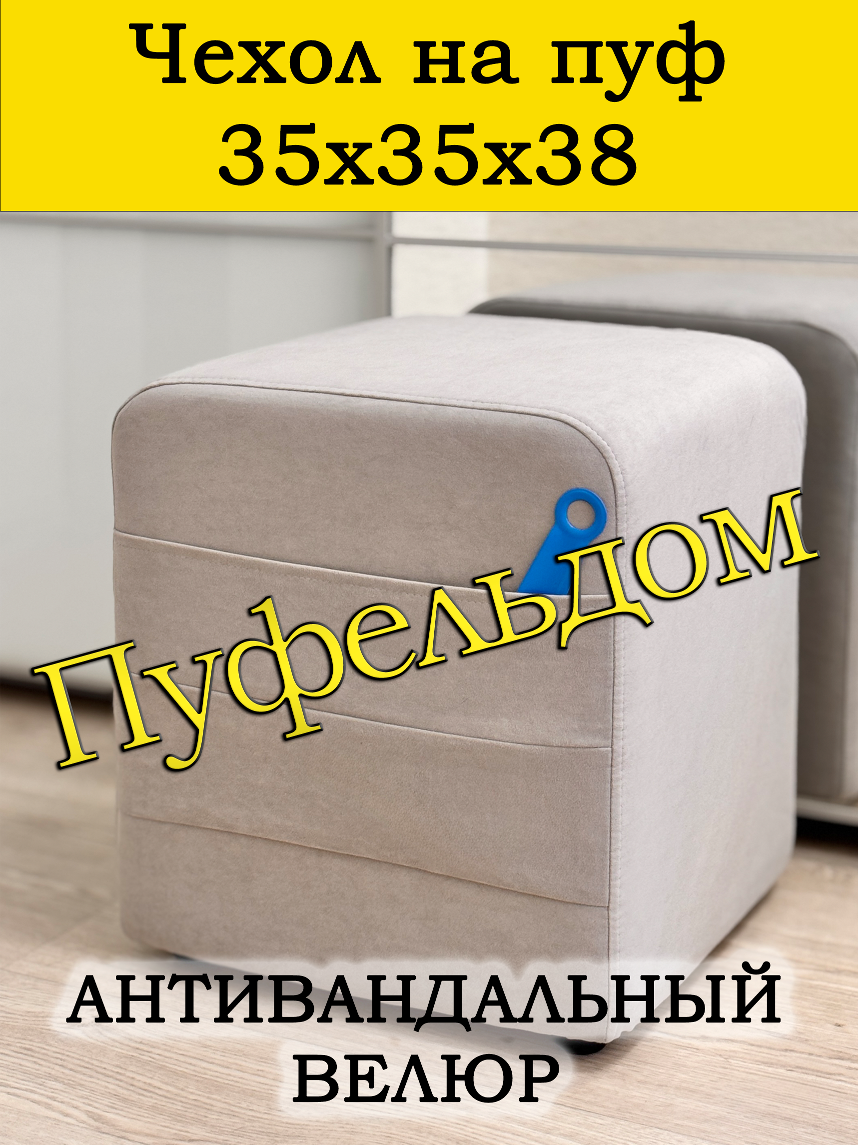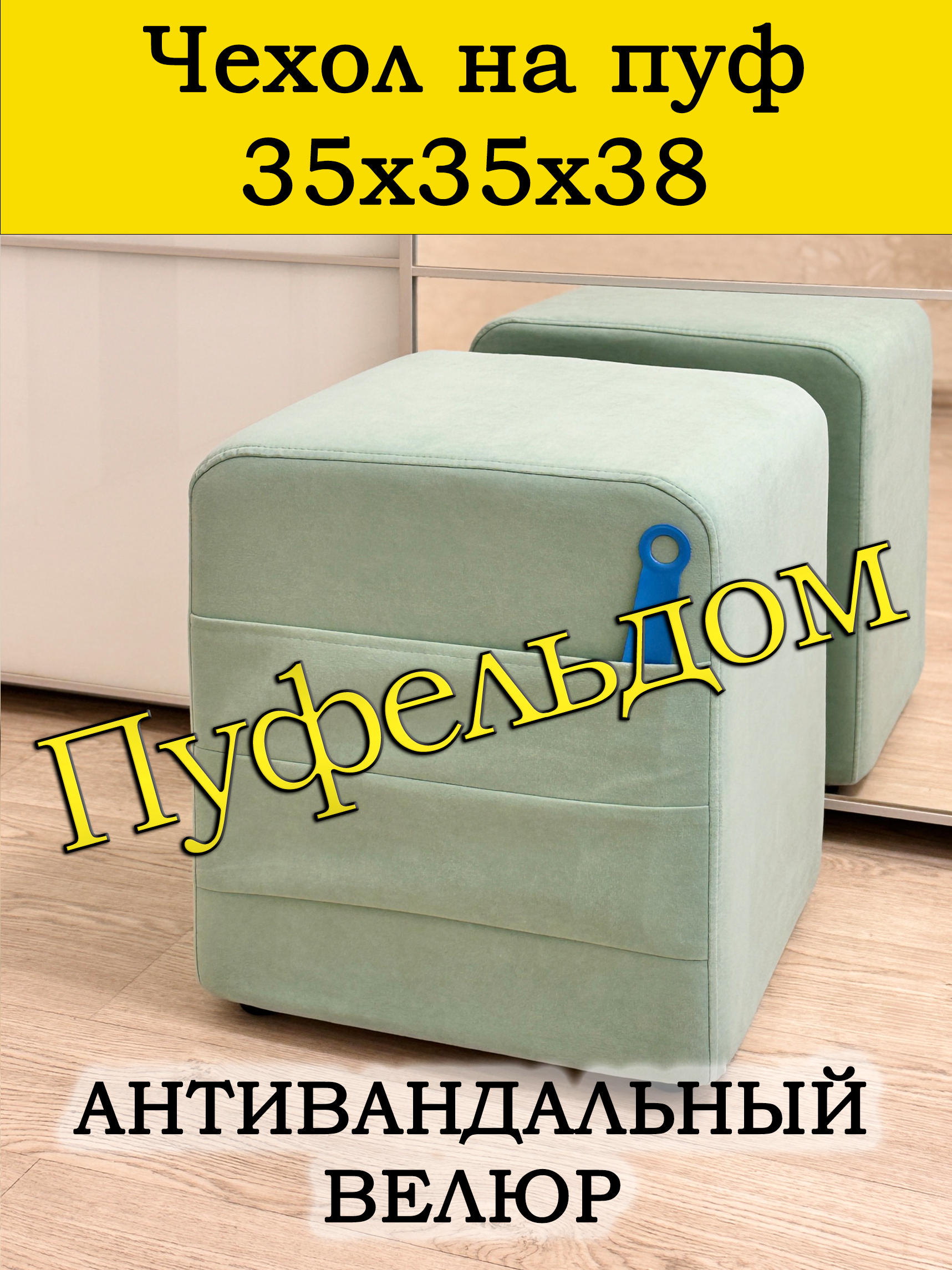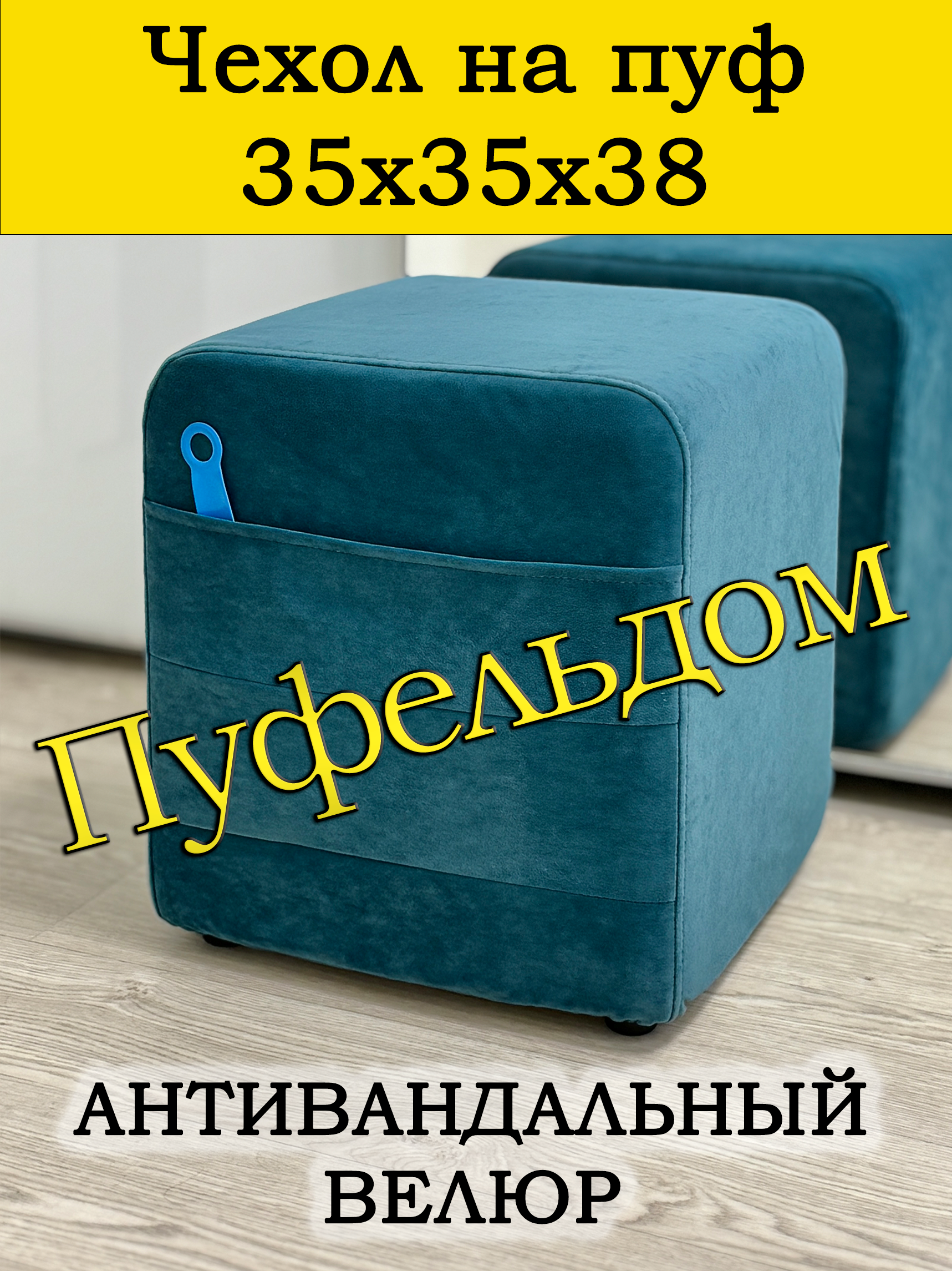 Чехол на пуфик квадратный 35 на 35 см высотой 38 см. Чехол на пуфик изготовлен из антивандального велюра. Материал не тянется. Чехол может подойти на пуфик квадратный 34 на 34, при этом высота его изменится соответственно. Снизу фиксируется крепким шнурком - более надёжным аналогом резинки. Эта накидка на пуф защитит Ваш пуфик от загрязнений, царапин, когтей домашних животных и потёртостей. Чехол на пуфик вернёт жизнь Вашему старому пуфу, добавит изюминку интерьеру и поднимет Вам настроение. Чехол легко очищается от шерсти домашних животных, пыли, грязи и пятен. Чехол из велюра стирается в стиральной машине при температуре 30-40 градусов. Наши чехлы на пуфы будут служить Вам долгие годы!