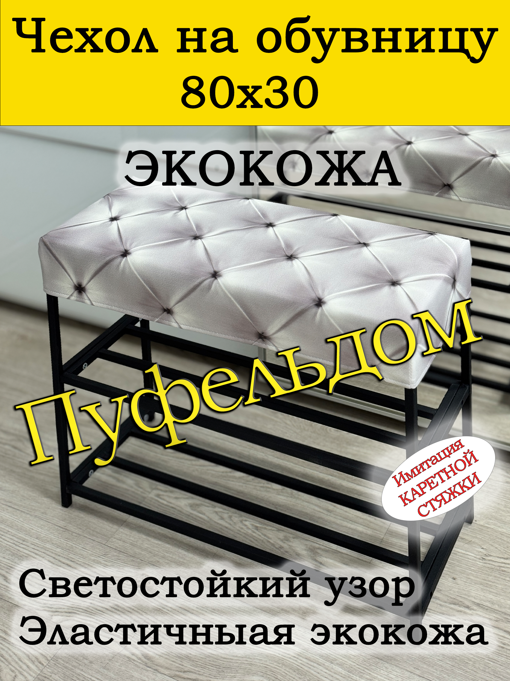 Чехол на обувницу прямоугольный 80 на 30 см высотой 10 см. Изготовлен из эластичной экокожи. Эта накидка для прихожей защитит Ваш пуфик от загрязнений, царапин, когтей домашних животных и потёртостей. Чехол на банкетку вернёт жизнь Вашему старому изделию, добавит изюминку интерьеру и поднимет Вам настроение. Чехол легко очищается от шерсти домашних животных, пыли, грязи и пятен. Изделие будет служить Вам долгие годы! Чехол слегка тянется, но рекомендуем выбирать размер в размер.