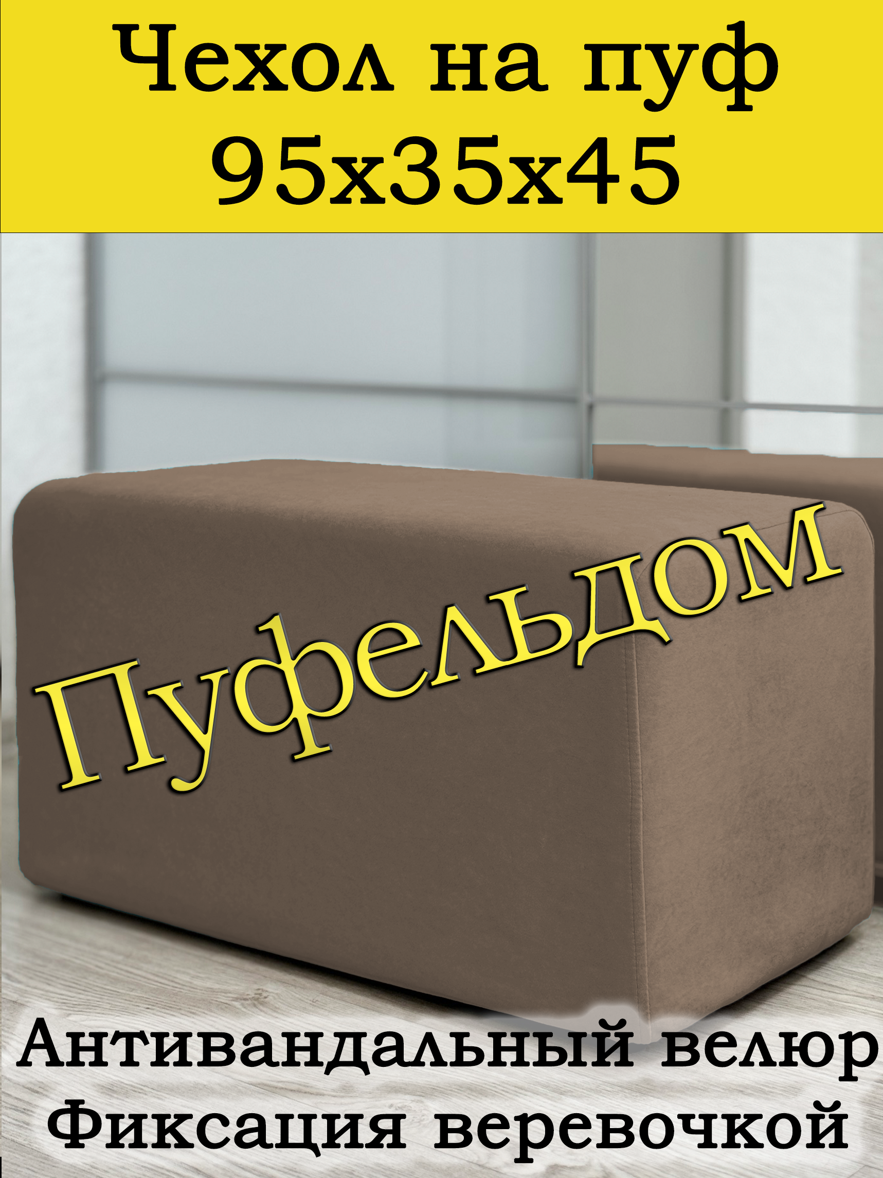 Чехол на пуф прямоугольный 95 на 35 см высотой 45 см. Чехол на пуфик изготовлен из износостойкого антивандального велюра. Чехол может подойти на пуфик прямоугольный 94 на 34 и 96 на 36, при этом высота его изменится соответственно. Снизу фиксируется крепким шнурком - более надёжным аналогом резинки. Эта накидка на пуф защитит Ваш пуфик от загрязнений, царапин, когтей домашних животных и потёртостей. Чехол на пуфик вернёт жизнь Вашему старому пуфу, добавит изюминку интерьеру и поднимет Вам настроение. Чехол легко очищается от шерсти домашних животных, пыли, грязи и пятен. Чехол из велюра стирается в стиральной машине при температуре 30-40 градусов. Наши чехлы на пуфы будут служить Вам долгие годы! Чтобы правильно подобрать размер чехла переверните свой пуфик вниз сиденьем, измерьте его высоту от пола до дна, измерьте расстояние от края до ножек на подгиб. Для измерения длины и ширины положите пуф на бок и измерьте расстояние от пола до верхней точки.