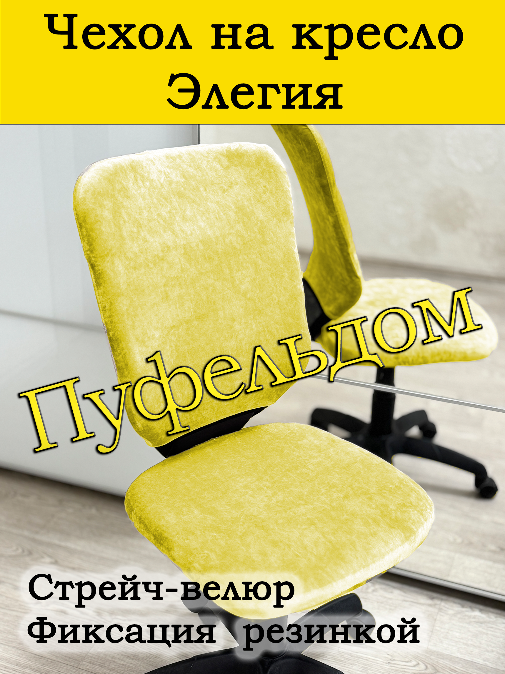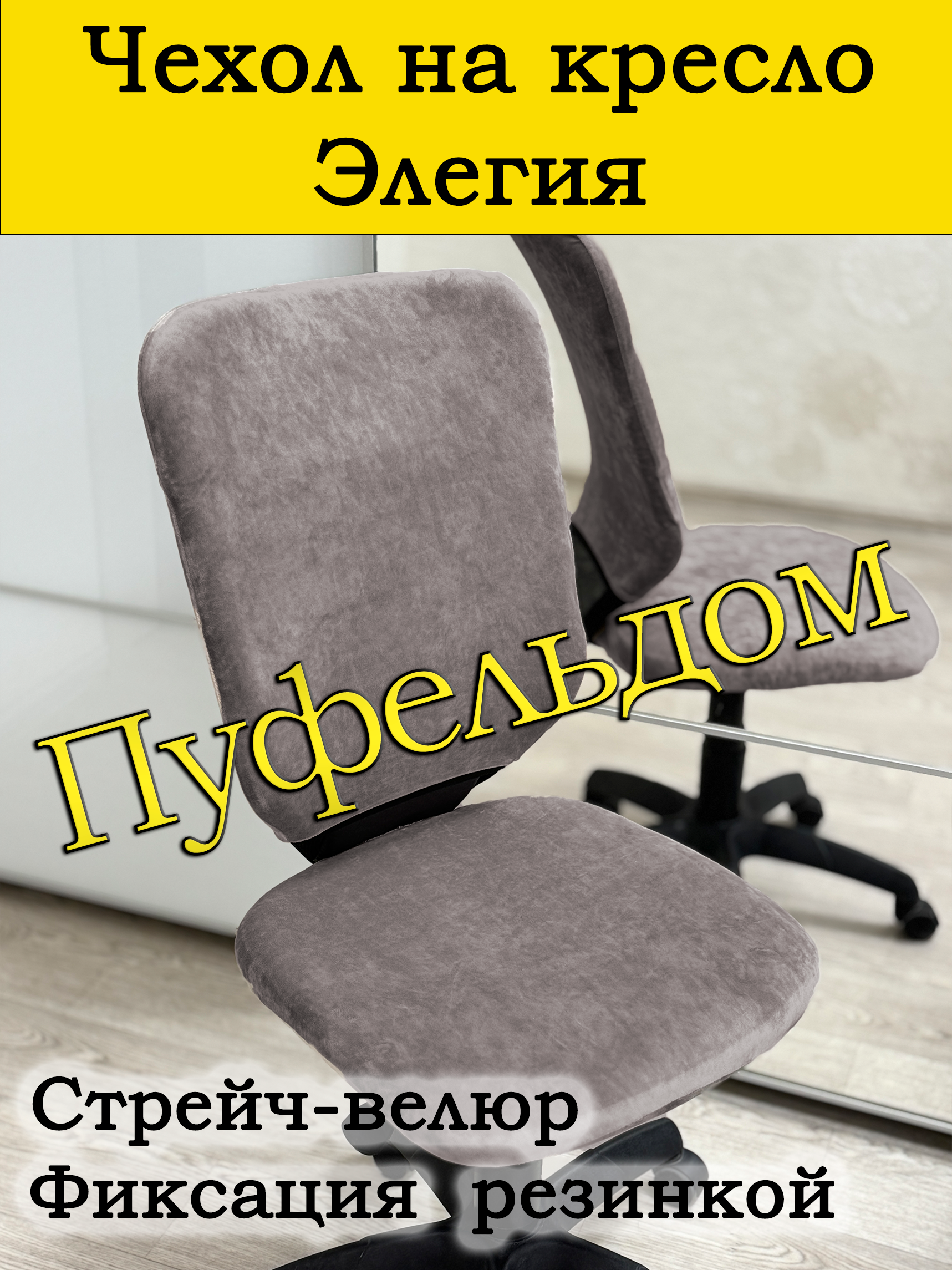 Безразмерный чехол для офисного компьютерного кресла изготовлен из тянущегося велюра. Спинка и сиденье снизу фиксируются крепкой резинкой. Может подойти и на другие модели подобных форм и размеров. Ширина спинки 40 см, высота спинки 56 см, размер сиденья 44х44 см. Размеры Вашего кресла могут быть больше заявленных на 25%
