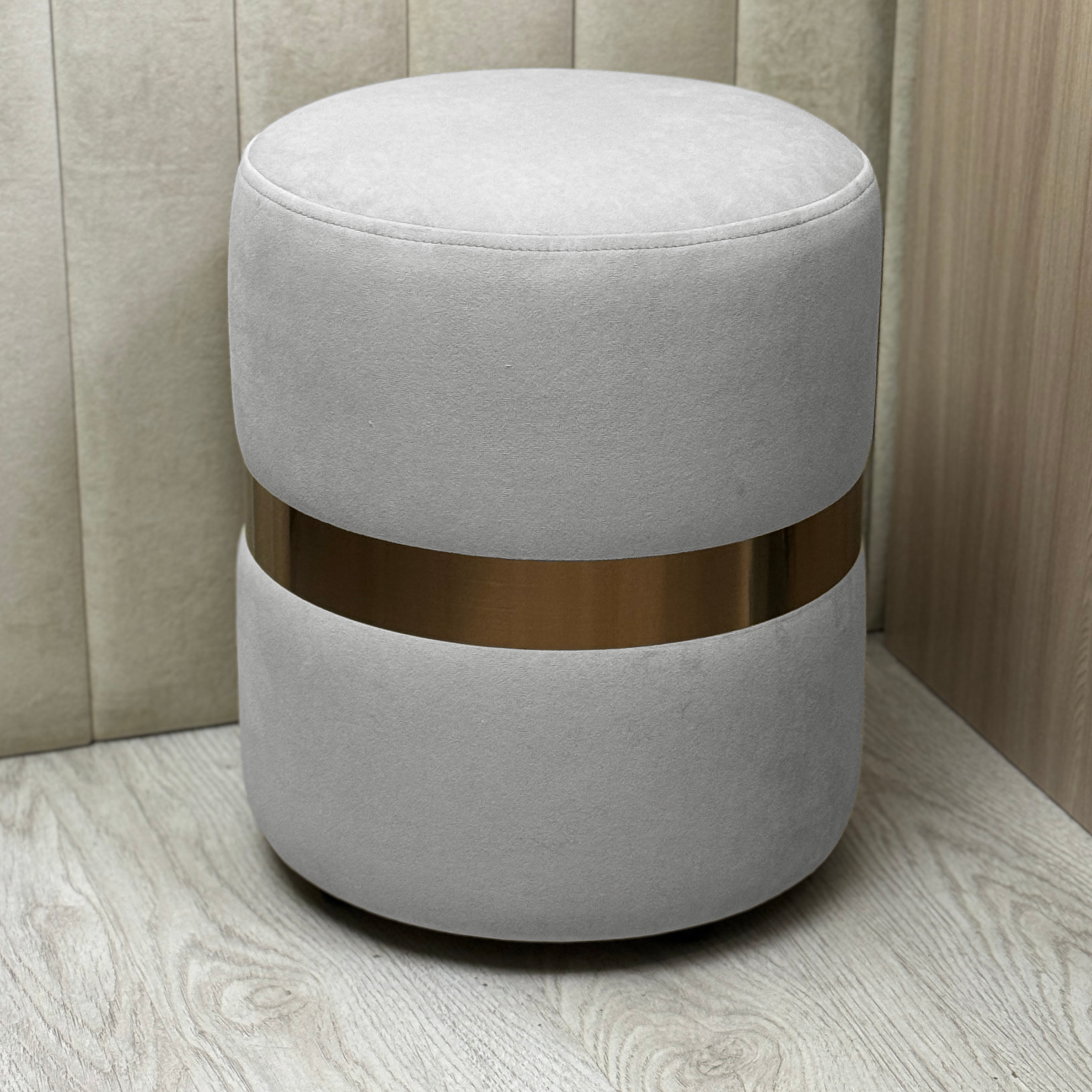 Круглый пуфик для туалетного столика, спальни, гостиной, прихожей, примерочной изготовлен из великолепного матового велюра без "пальчикового" эффекта. Центральная его часть декорирована стальной нержавеющей зеркальной лентой под серебро или золото. Возможно индивидуальное изготовление.